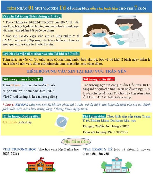Trung tâm Y tế khu vực Trấn Yên trân trọng thông báo lịch triển khai tiêm chủng vắc xin phòng bệnh uốn ván và bạch hầu cho trẻ đủ 7 tuổi địa bàn cụ thể như sau: